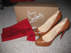 They are Louboutin Camel Rolando’s. I LOVE THEM!!  I baby these puppies. The soles have been  protected and every night they go into there pouch and back into the box. The color goes with everything I own, dressy or rugged.  The leather has molded to my feet and the 5″ heel makes me tower over everyone and feel like the office queen, I’m 5’9″ flat footed. I feel sexy, confident, and powerful.